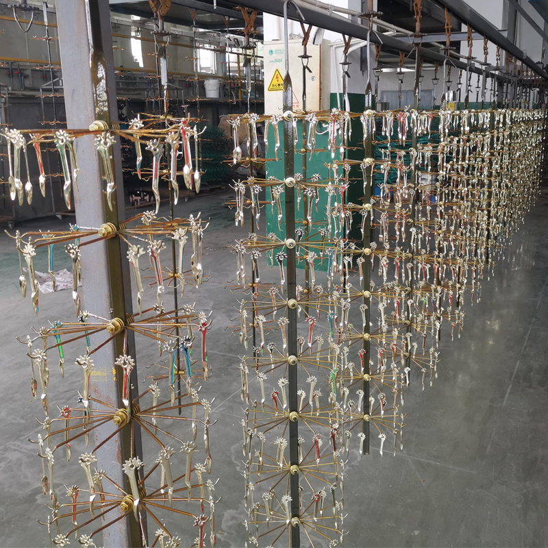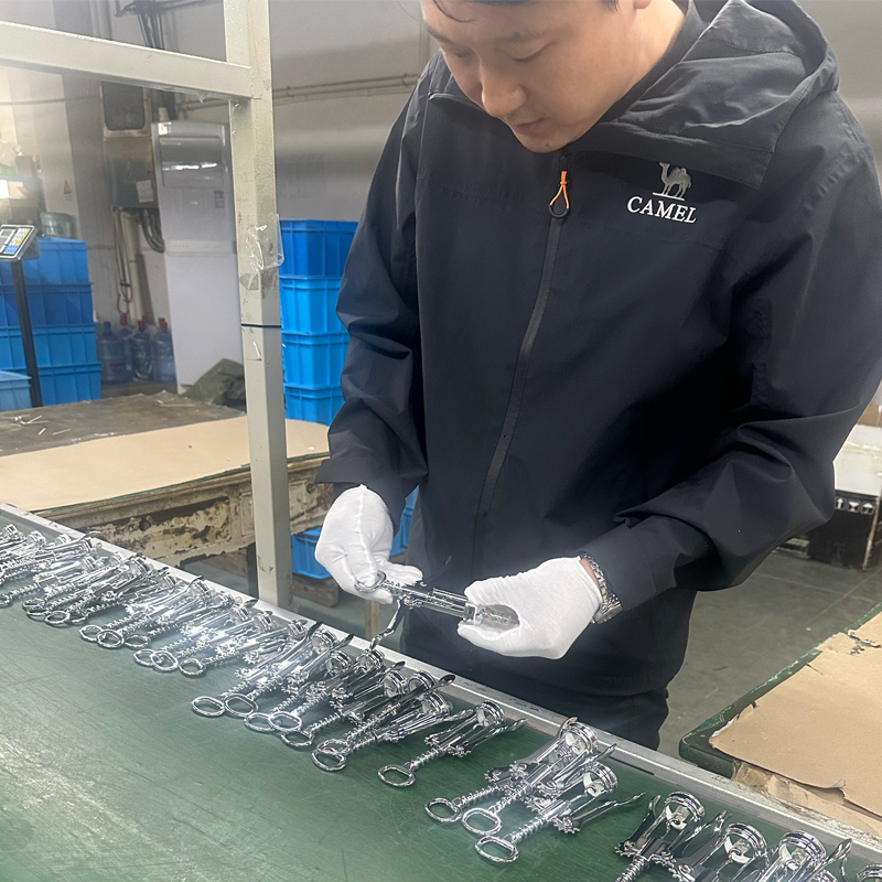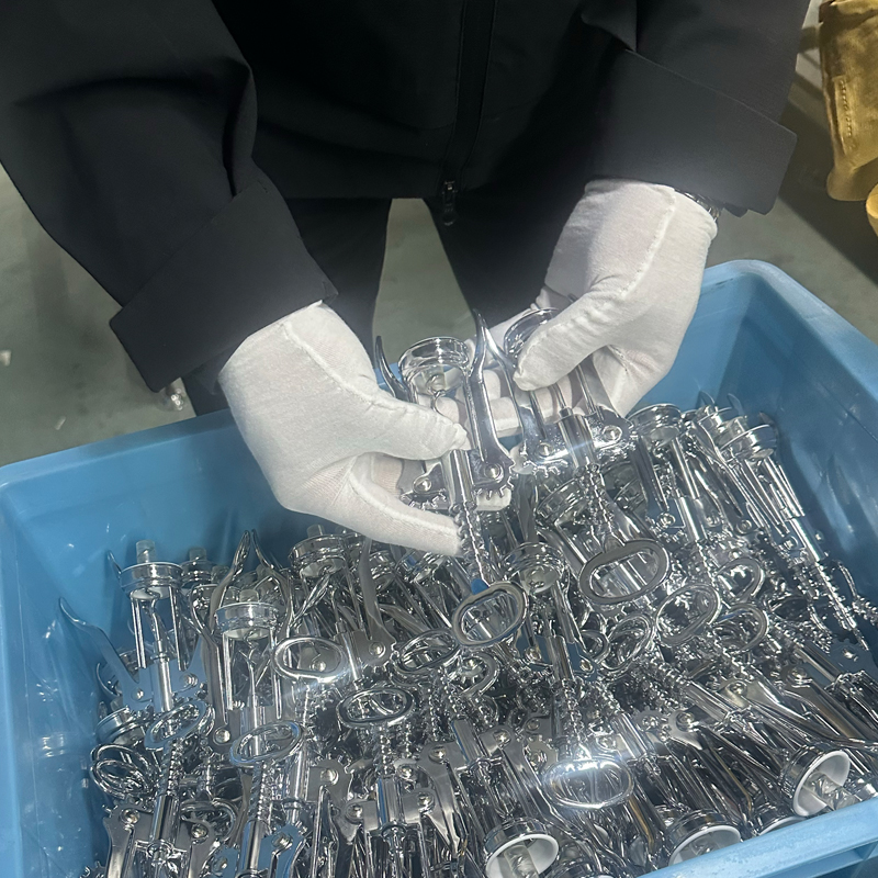 कॉर्कस्क्रू के सभी घटकों पर कोटिंग आमतौर पर इलेक्ट्रोप्लेटिंग या पेंटिंग विधियों का उपयोग करती है, इस उदाहरण के लिए, हम इलेक्ट्रोप्लेटिंग पर ध्यान केंद्रित करेंगे। इलेक्ट्रोप्लेटिंग प्रसंस्करण एक आउटसोर्स आपूर्तिकर्ता द्वारा पूरा किया जाता है, जिसके लिए कई बुनियादी तकनीशियनों और अनुभवी श्रमिकों के साथ-साथ अपने क्षेत्र में वर्षों के अनुभव के साथ अत्यधिक विशिष्ट सुविधाओं, उपकरण और उद्योग इंजीनियरों की आवश्यकता होती है। यह एक बहुत ही जटिल प्रक्रिया है। हम उन आपूर्तिकर्ताओं के साथ दीर्घकालिक सहयोग बनाए रखते हैं जिनके पास 30 वर्षों का उद्योग अनुभव है, जो उत्पाद स्थिरता सुनिश्चित करता है। इससे यह भी सुनिश्चित होता है कि विनिर्माण के दौरान आने वाले विभिन्न उत्पादन मुद्दों को जल्दी, पेशेवर और कुशलता से संबोधित किया जा सकता है। ये व्यवस्थाएं ग्राहकों की बिक्री योजनाओं का समर्थन करते हुए वाइन सहायक उपकरण, बरतन और कॉर्कस्क्रूज़ जैसी वस्तुओं के लिए उत्पादन चक्र सुनिश्चित करने में मदद करती हैं।