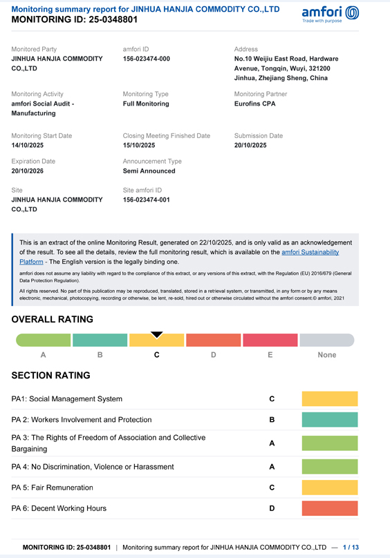 जिंहुआ हंजिया कमोडिटी कंपनी लिमिटेड ने अपने बीएससीआई ऑडिट के नतीजे जारी किए हैं। 14 अक्टूबर को, कंपनी ने सफलतापूर्वक पेशेवर मूल्यांकन पारित किया और क्लास सी प्रमाणीकरण प्राप्त किया, जो ग्राहक द्वारा निर्दिष्ट न्यूनतम आवश्यकता को पूरा करता है। इस प्रमाणीकरण की वैधता अवधि एक वर्ष है। बीएससीआई ऑडिट ग्राहक द्वारा चयनित यूरोफिन्स एजेंसी द्वारा आयोजित किया गया था। यह ग्राहक लंबे समय से हमारी कंपनी से वाइन ओपनर, वाइन सहायक उपकरण और कॉकटेल शेकर जैसे स्टेनलेस स्टील उत्पाद खरीद रहा है। ग्राहक के देश की आवश्यकता है आपूर्तिकर्ताओं के पास यह प्रमाणीकरण होना चाहिए।