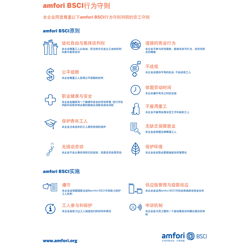 बीएससीआई नियमों की आवश्यकताओं के अनुसार, हमारी कंपनी बीएससीआई सिद्धांतों के प्रभावी कार्यान्वयन को सुनिश्चित करने के लिए एम्फोरी बीएससीआई आचार संहिता में उल्लिखित श्रम दिशानिर्देशों का सख्ती से पालन करेगी। उत्पादन प्रक्रिया के दौरान, हम स्वतंत्र और लोकतांत्रिक तरीके से यूनियन स्थापित करने और सामूहिक सौदेबाजी में भाग लेने के श्रमिकों के अधिकारों का सम्मान करते हैं। हम गैर-भेदभाव, बाल श्रम के रोजगार से बचने और यह सुनिश्चित करने के लिए भी प्रतिबद्ध हैं कि श्रमिकों को उचित श्रम प्रथाएं और मुआवजा मिले। इसके अतिरिक्त, हम गारंटी देते हैं कि श्रमिकों के पास अच्छे काम के घंटे और अन्य मौलिक अधिकार हैं।